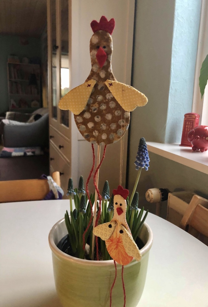 Du skal medbringe stofrester til krop og vinger, filtrester til næb og kam, perler til øjne, kraftig snor til ben, små knapper til at sy vingerne fast med.