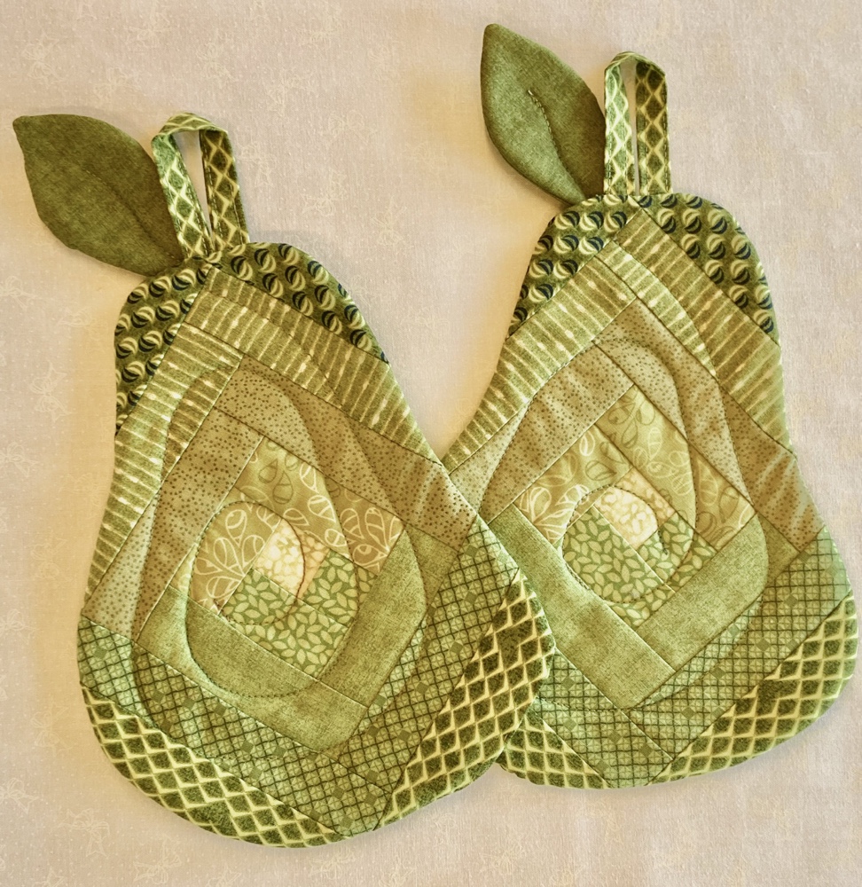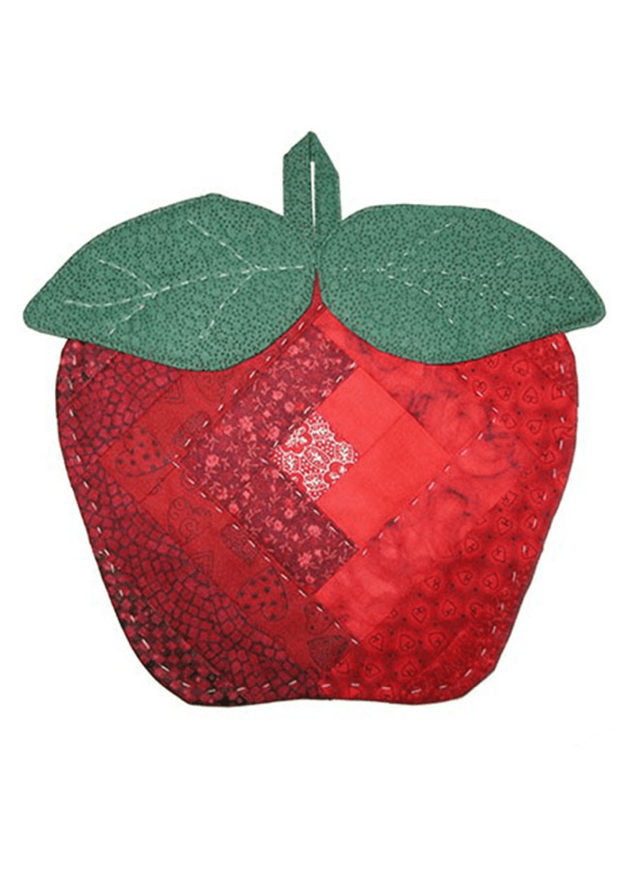 Du kan sy grydelapper med form som æbler og pærer i log cabin. Hertil skal du medbringe stofrester i røde eller grønne nuancer. Du skal også have Vlies med til at tegne mønstret over på og senere sy på. Grydelapperne kan syes på maskine eller i hånden.